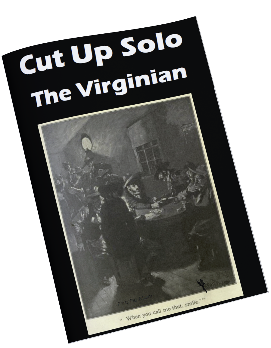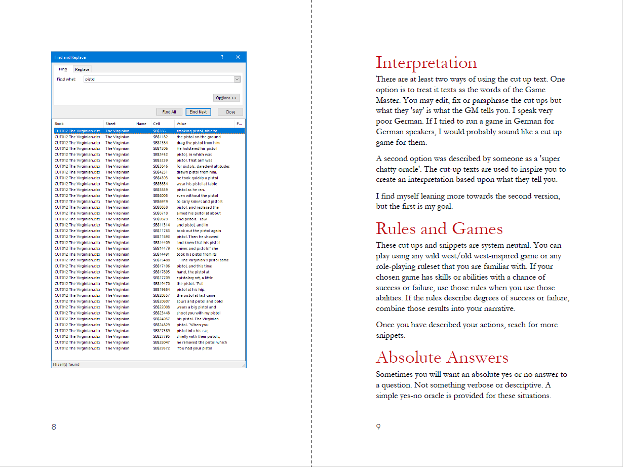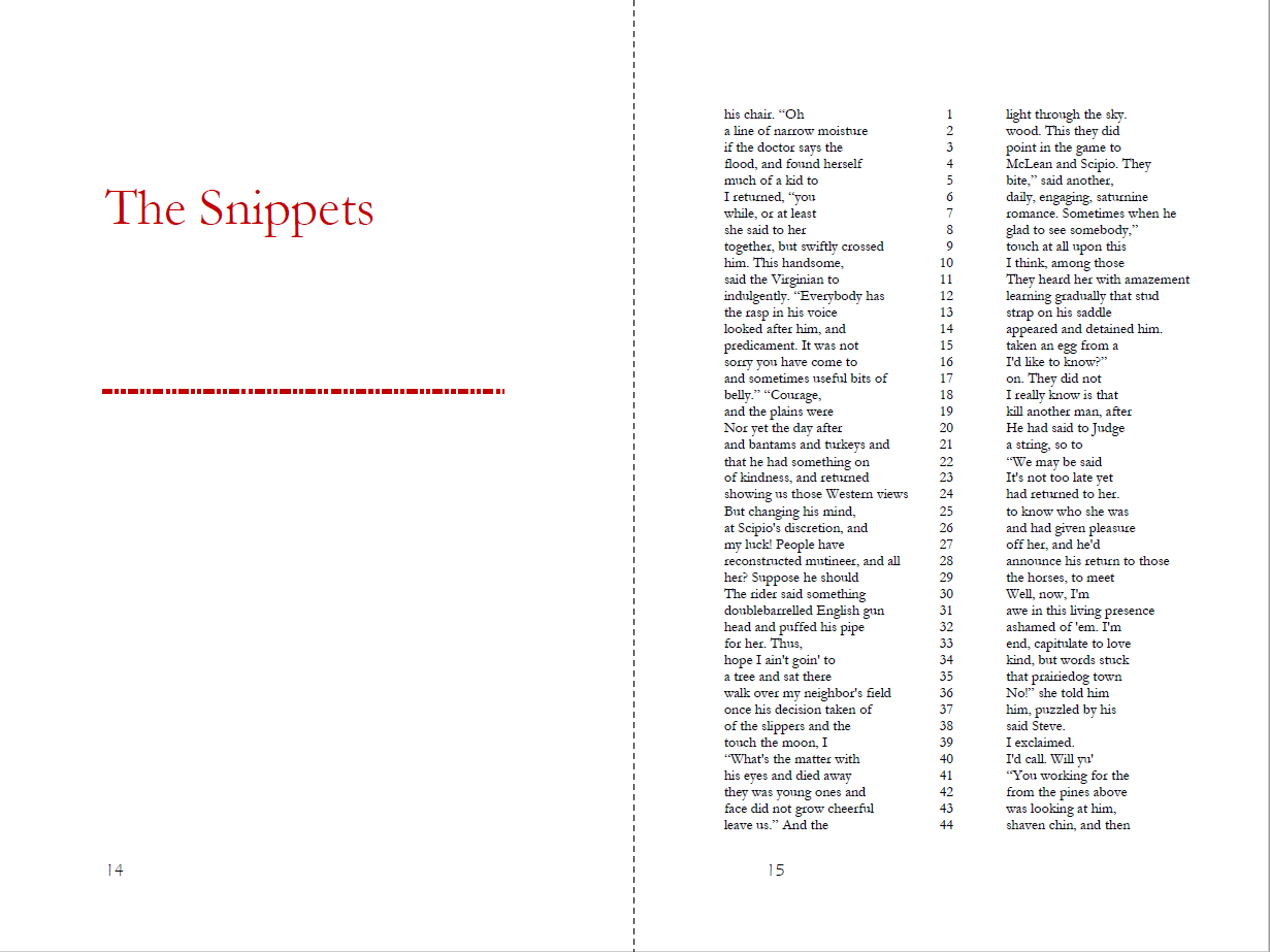 This PDF contains 2000 random snippets organized into two d1000 tables. The attached spreadsheets, in Excel and Open Document Format, contain all the text of The Virginian: A Horseman of the Plains, chopped into short snippets of about 5 words. It also has spreadsheets set up to grab 20 snippets at once at random.