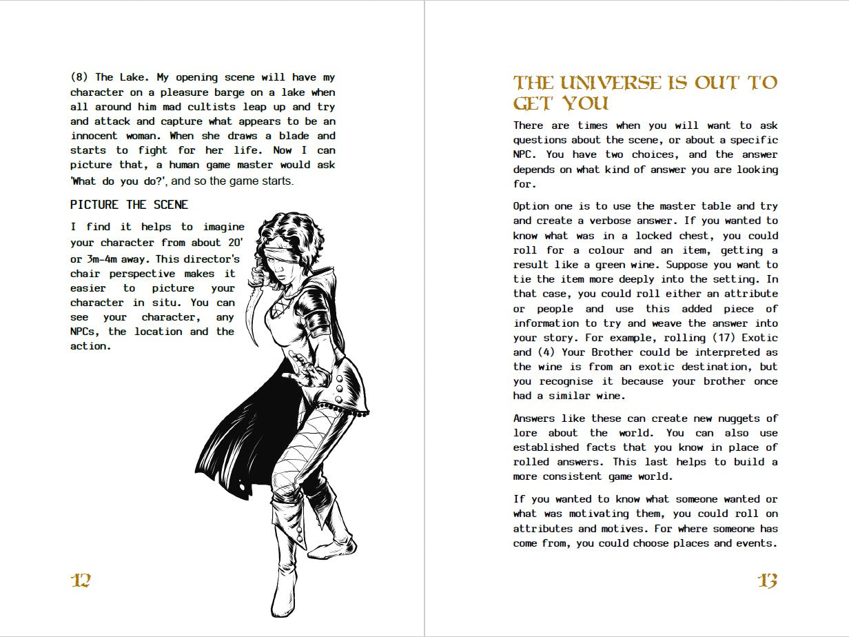 There are three key tools in this solo supplement. The Master Table is a d20 table of different themed aspects, people, places, items, events and so on. You pick the aspects that relate to your situation and then mix and match the elements you rolled to answer questions and flesh out ideas. The yes-no oracle is a d20, roll high for yes, low for no, but takes the characters Luck attribute into consideration. The effect is that at the start of adventures, this start of in a kind of 'easy mode' but things ramp up to become quite challenging. The third feature is the adventure design chapter and using instant random encounter tables. Short, simple d6 tables, but each one customised to exactly where you are and what you are doing.