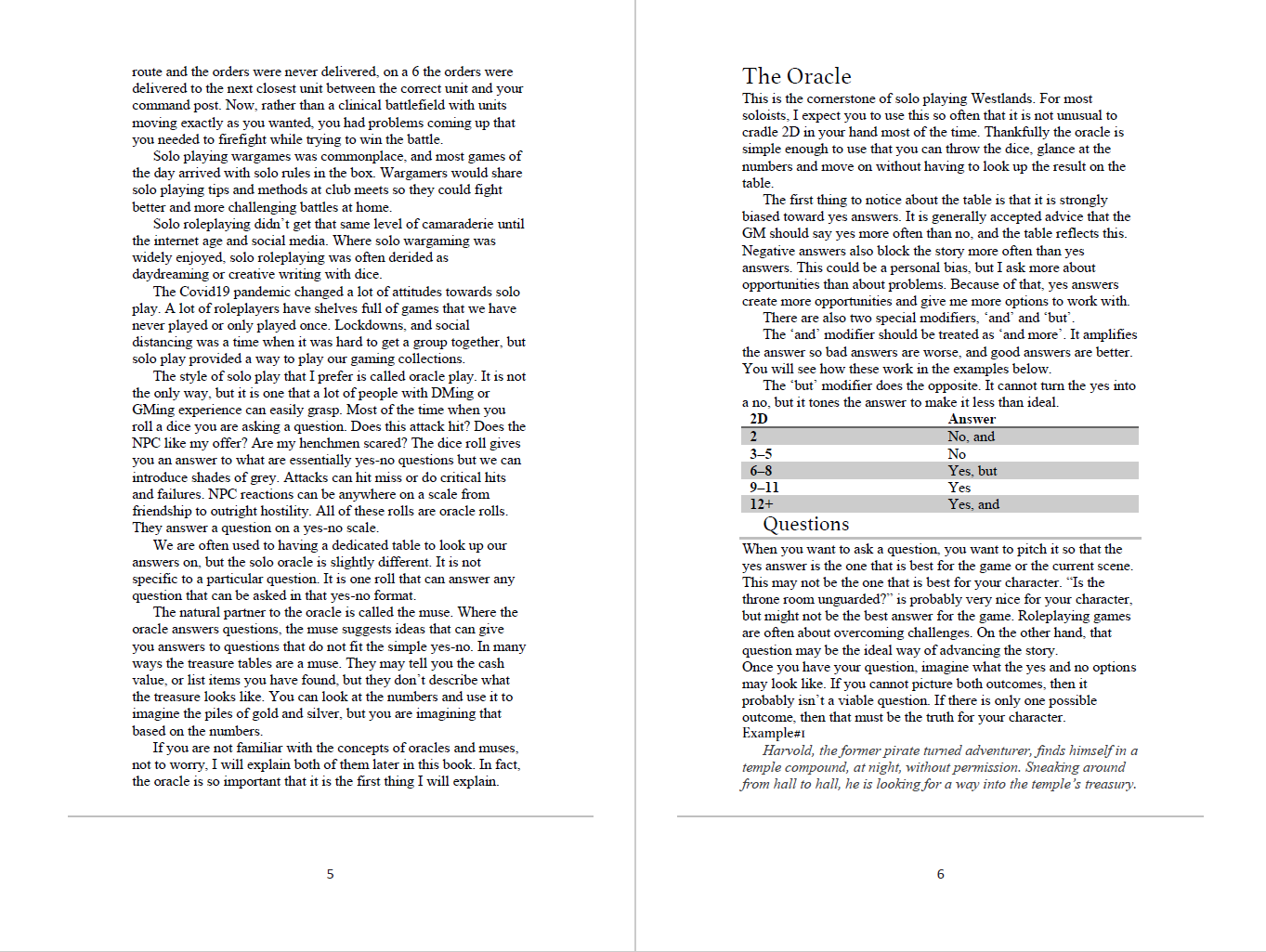 These rules share some similarities with my Barbaric! solo rules, my rules are called Brute!, but use a slightly simpler oracle, and different drama system. Brute uses a shrinking dice pool system, these rules use a countdown system using a d66.