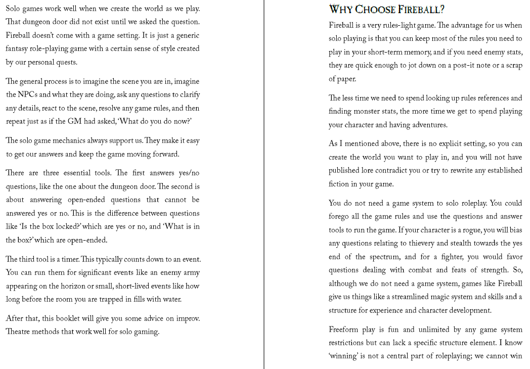 Solo games work well when we create the world as we play. That dungeon door did not exist until we asked the question. Fireball doesn’t come with a game setting. It is just a generic fantasy role-playing game with a certain sense of style created by our personal quests.