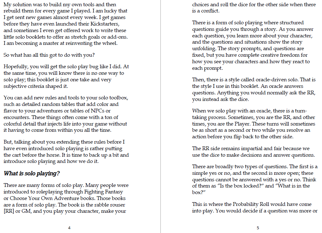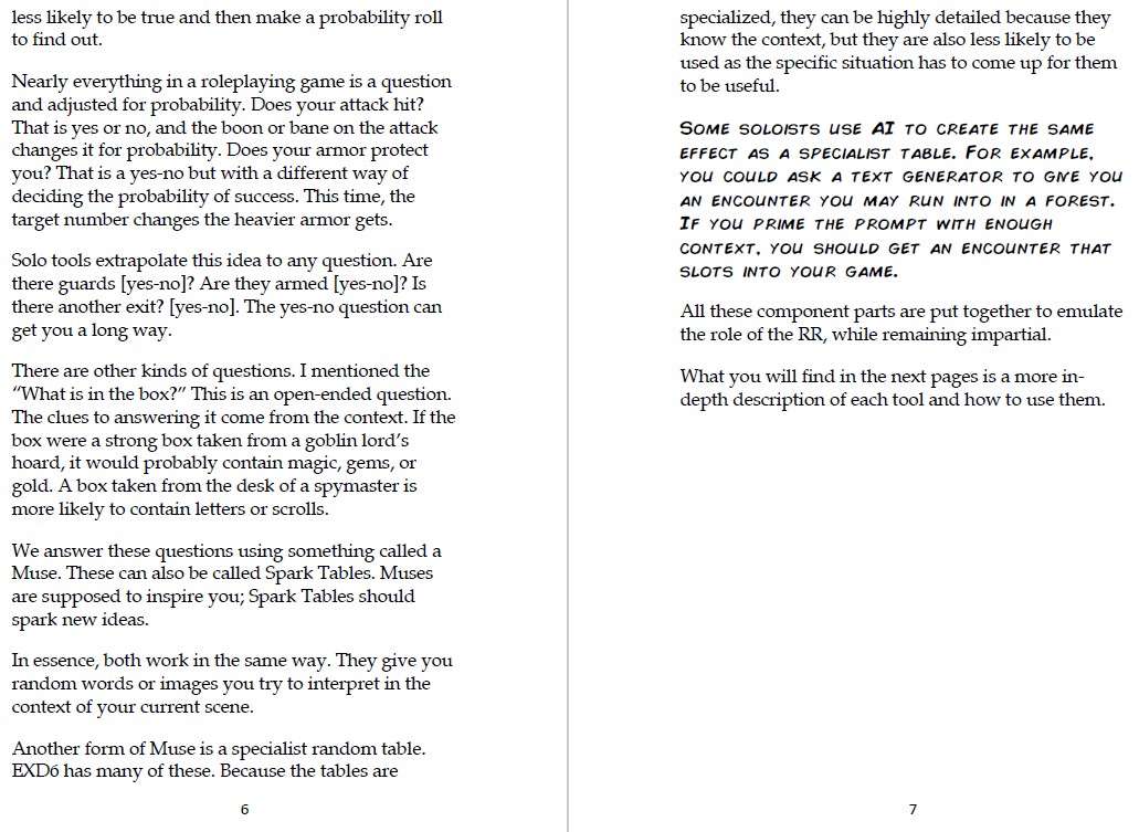 These solo rules use that same 1, 2, 3-5, and 6 spread for its oracle, and more of the familiar systems within EZD6 to run the solo tools.