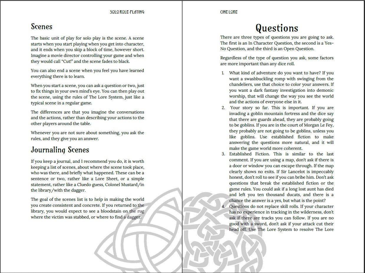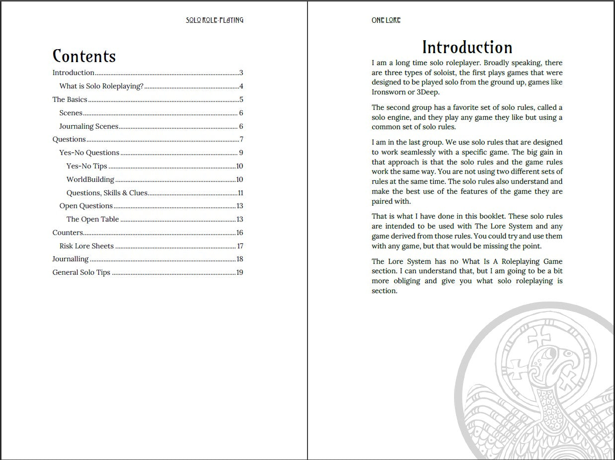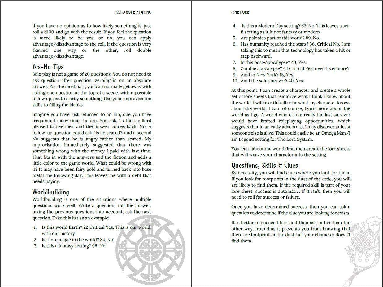 This rules supplement adds solo roleplaying to The Lore System. It can also be used with other BRP/d100/D100 lite systems if you are familiar with the way that The Lore System uses Lore Sheets.