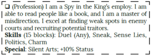 Lore Sheets are a one-paragraph nugget of setting lore, with the supporting game mechanics, that add a feature to a character, location or adventure. A lore sheet may describe your affiliate with a mercenary band and describe the skills you gained from that affiliation. A lore sheet describing your relationship to the royal court would also describe the benefits gained from that relationship. There is a sample below.