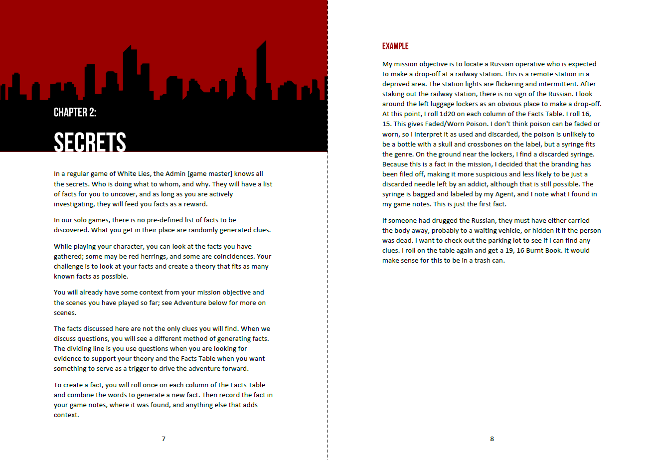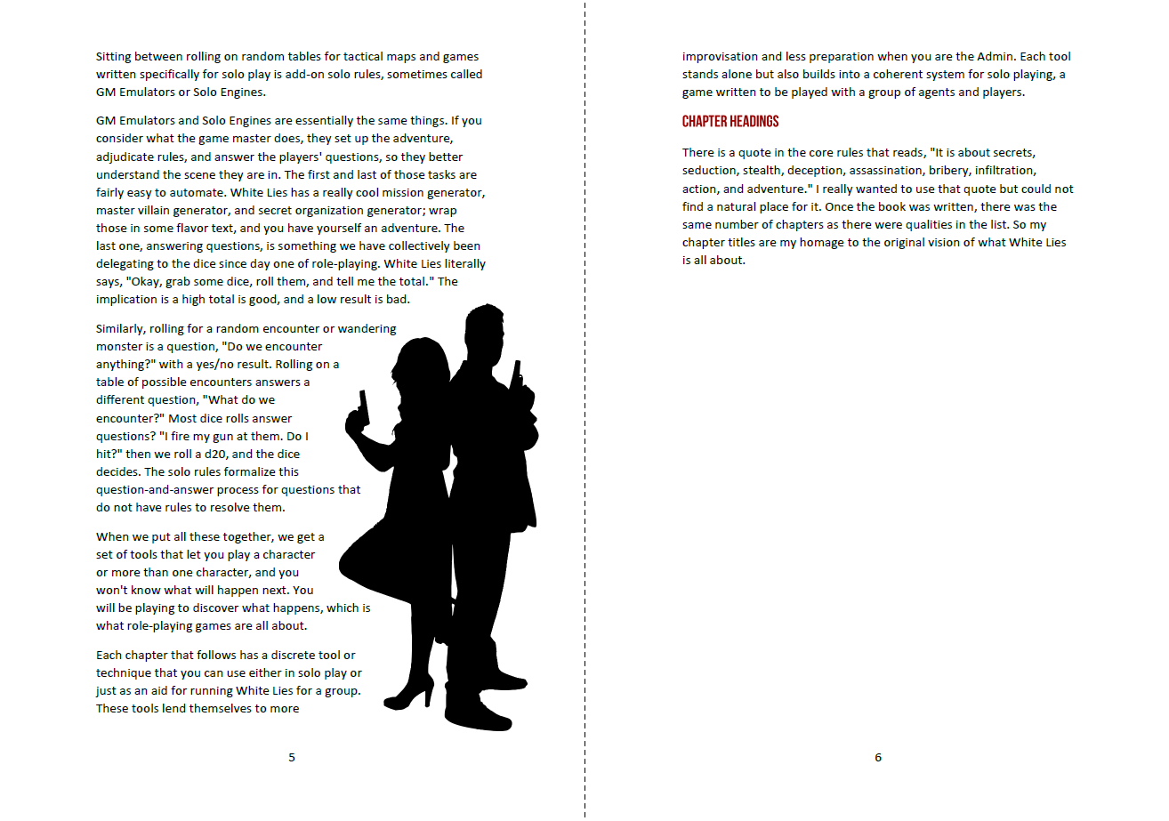 This is a solo rules supplement for White Lies by DwD Studios. The core game rules are derived from the OSR, but this game is so steeped in spies, espionage, James Bond etc that beyond the character creation is functionally a different game.