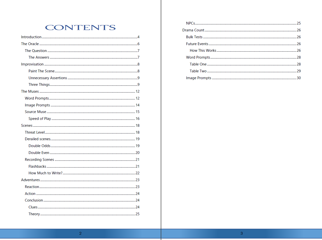 In addition to a simple yes-no oracle, three different styles of muse are presented. The first is a typical word pair tool, and the second uses pairs of icons that are used for inspiration. The third muse uses the dice to traverse books or videos, whatever it was that inspired your game, to pick out random bits of the text that you sample and try to apply the ideas to answer your questions. Examples of each type of muse are included.