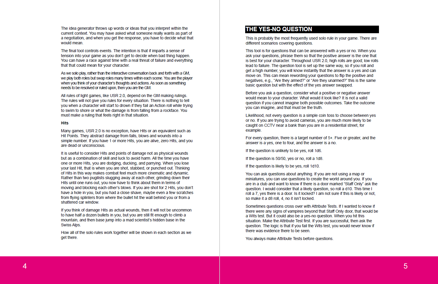 Scott Malthouse kindly permitted me to create these rules for USR 2.0. The cool thing about simple and universal systems like USR 2.0 is that you can learn one system and then play anything anywhere. You can hold the rules in your head and play without having to reference rulebooks constantly.